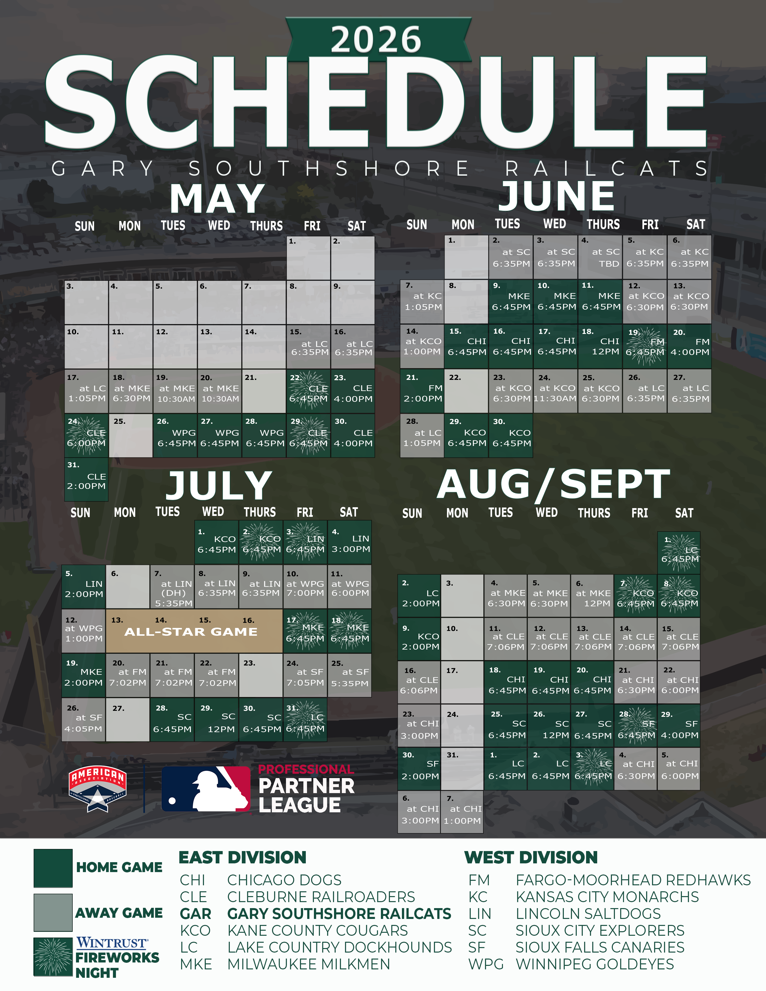 219.882.2255 [email protected] HomeTickets Ticket Packages Ticket Package InformationSingle Game TicketsFlex PacksSeason PassSeason Tickets Group Outings Group Package InformationGroup TicketsFeralloy Picnic PatioParty DecksLuxury Suites Group Experiences School Day GameCommunity NightsBirthday PartiesYouth and Senior Days Schedule 2026 Season SchedulePrintable SchedulePromotional ScheduleDaily Deals Team Team Info Current RosterCoaching Staff Front Office Front Office StaffOwnershipEmploymentInternships Stats & Standings American Association StandingsBatting StatisticsPitching StatisticsAmerican Association League Leaders StoreBallpark Our Stadium DirectionsSeating ChartBallpark A to Z Rent The Steel YardFan Zone Participate National AnthemPregame PerformancesSummer Reading ProgramHost FamiliesPocket Schedules Rusty The Railcat About RustyAppearancesRusty’s Kids Club News and More NewsletterGame ProgramPress ReleasesLive Broadcast Community Hero of the GameDonation Requests