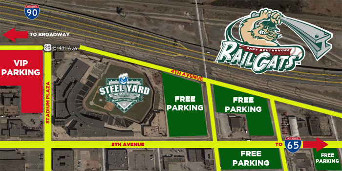 The RailCats main general admission lot is located next to the Diamond Club just to the east of U. S. Steel Yard. The lot can be accessed from either direction by turning onto Virginia Street off 4th and 5th Avenues. Parking is also available to the east and west of the stadium off 4th and 5th Avenues and just south of the ballpark. The RailCats V.I.P lot for Season Ticket holders is located on Stadium Plaza Drive adjacent to U. S. Steel Yard and is only accessible with a V.I.P. Parking Pass.